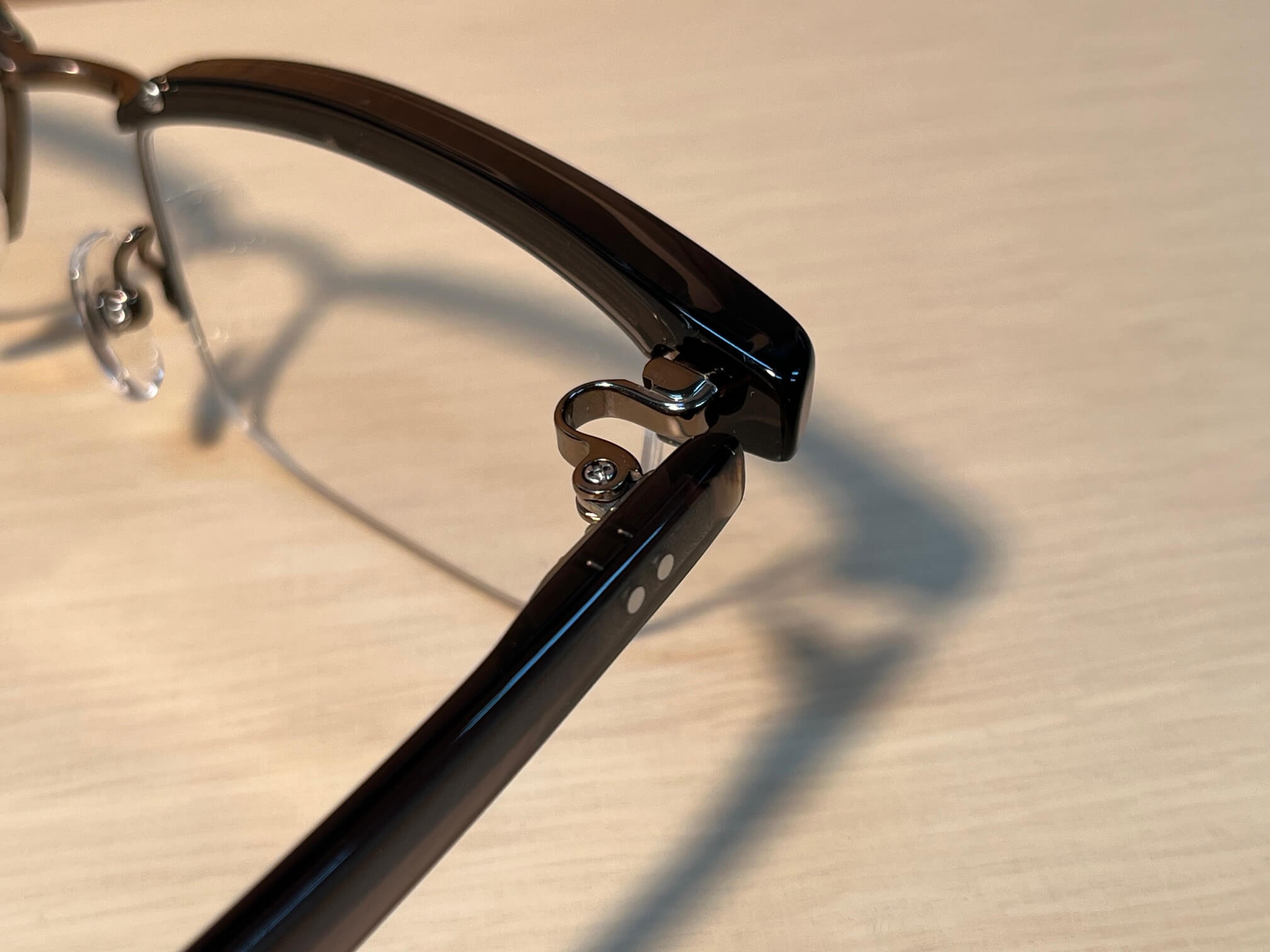 テンプル(つる)部分には、チタン製のかしめ蝶番を採用。