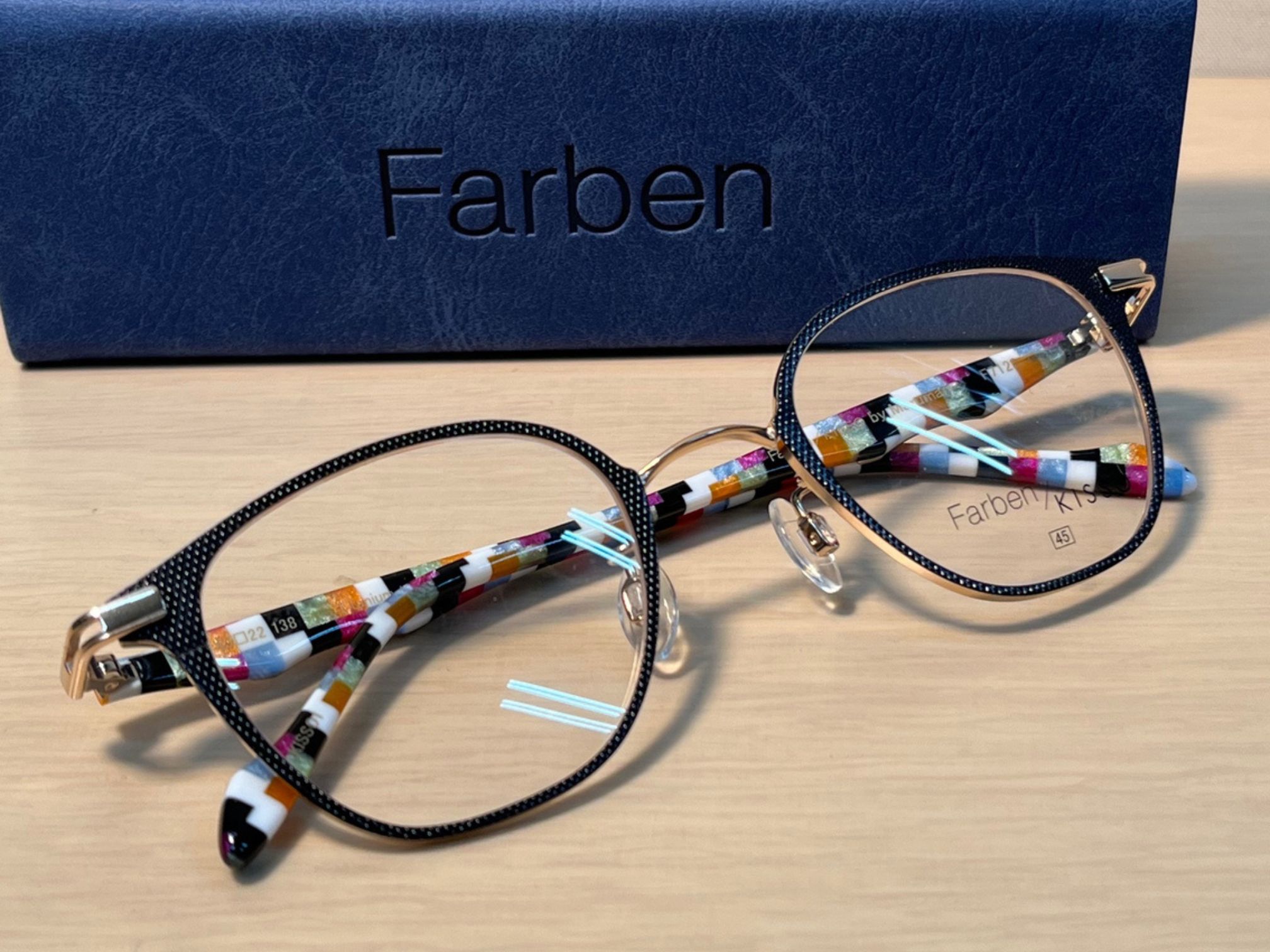 多色ブロック状のアセテート生地がランダムに組み合わされたモザイク調のテンプルは、まさに“Farben=色彩”を象徴する存在。
